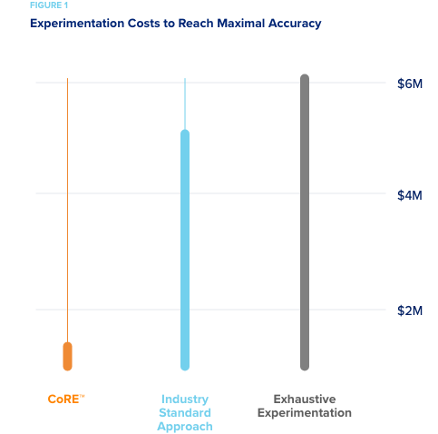 Given the EPA estimate that $6M was spent on the experiments to develop ToxCast, when monetized, current industry methods would have cost $4.8M to explore and achieve the level of accuracy that CORE would have achieved for $600K. An 87% savings!