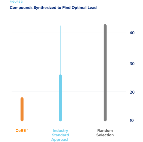 A smaller pharmaceutical company specializing in CNS drug development wished to assess how well CORE would have performed on a completed drug discovery campaign had it been used to direct experimentation. The pharma company conducted the campaign and identified a lead to advance after synthesizing a large number of compounds. In our simulations, CORE used their historical data to simulate an active learning approach as if it was directing compound synthesis. So all of their data was hidden from CORE and only revealed when CORE recommended a batch of compound be “synthesized.” Random selection required that on average 42 compounds be synthesized in order to predict the ideal compound. The “industry standard approach” required on average 25 compounds to be synthesized to produce an optimal lead. CORE required an average of only 18 compounds be synthesized to produce the optimal lead to advance.
